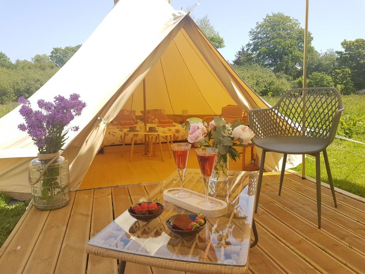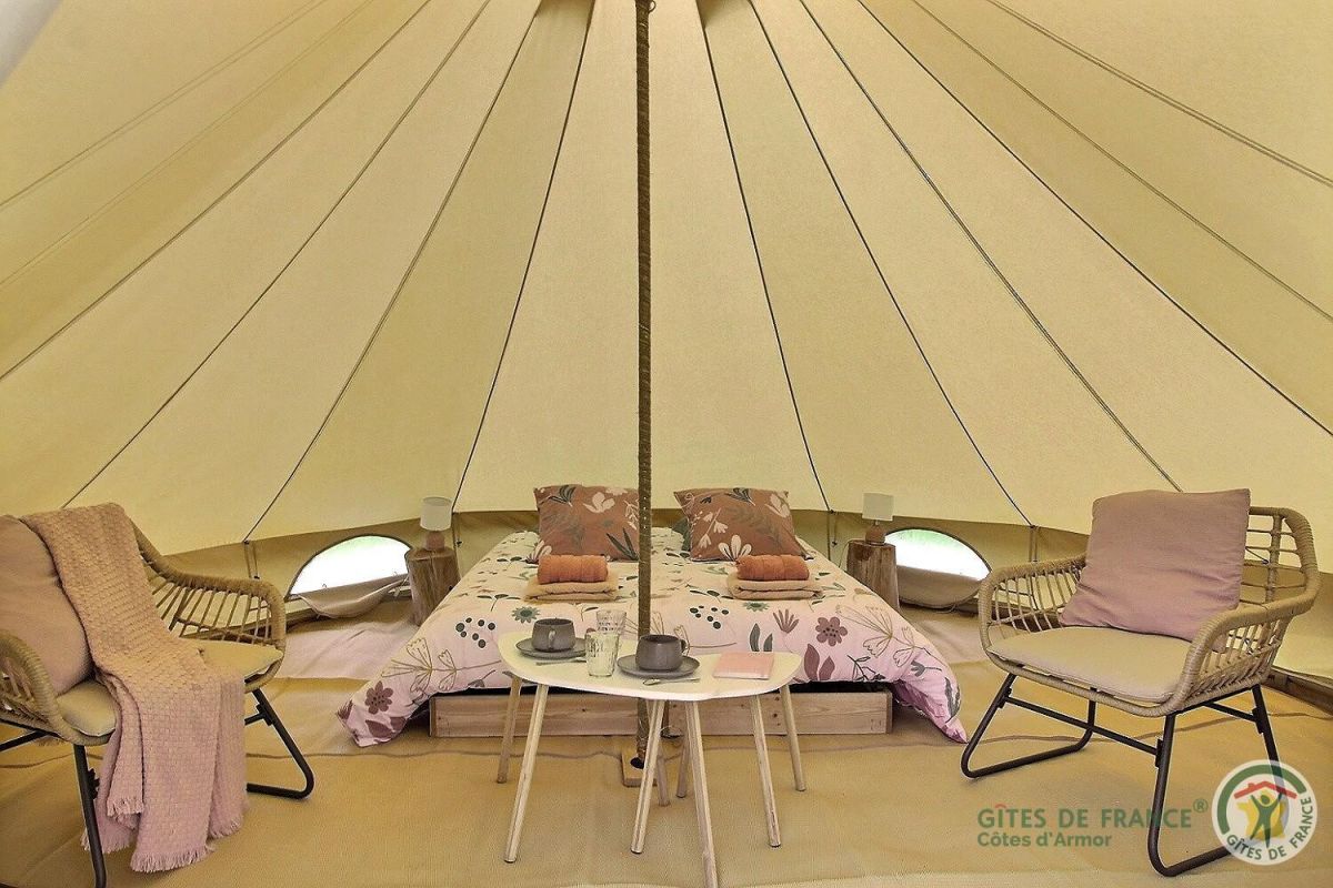 Vaste tente en coton en forme de tipi accueillant la chambre avec son lit 2 personnes en 160X200 et coin salon + mini-cuisine. Juste à côté : cabanon bois renfermant la salle d'eau privative avec douche d'angle, vasque et toilettes sèches. Terrasse bois de 5m² avec salon de jardin.