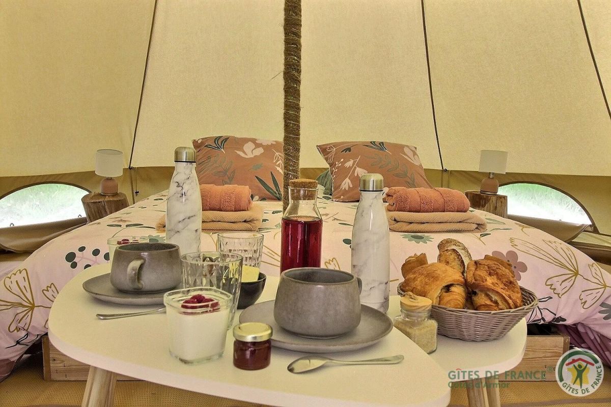 Vaste tente en coton en forme de tipi accueillant la chambre avec son lit 2 personnes en 160X200 et coin salon + mini-cuisine. Juste à côté : cabanon bois renfermant la salle d'eau privative avec douche d'angle, vasque et toilettes sèches. Terrasse bois de 5m² avec salon de jardin.