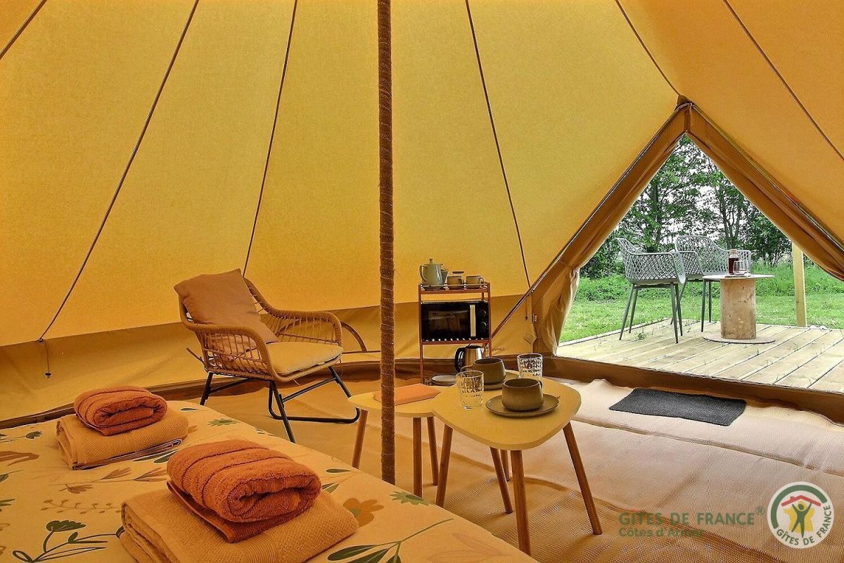 Vaste tente en coton en forme de tipi accueillant la chambre avec son lit 2 personnes en 160X200 et coin salon + mini-cuisine. Juste à côté : cabanon bois renfermant la salle d'eau privative avec douche d'angle, vasque et toilettes sèches. Terrasse bois de 5m² avec salon de jardin.