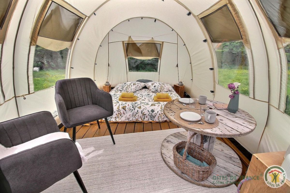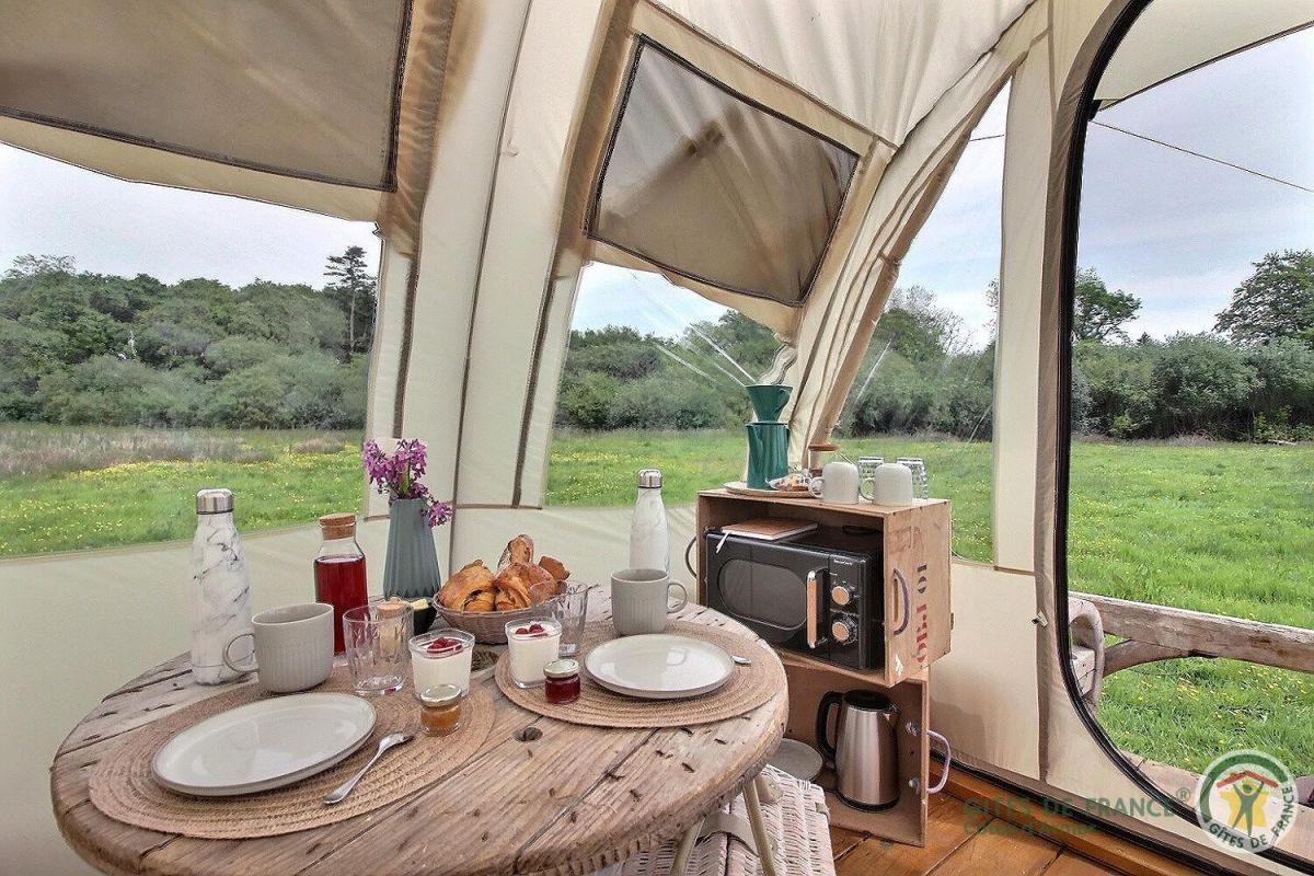 Sur la base d'une ancienne calèche de la ferme d'autrefois est posé une tente synthétique en forme de tunnel accueillant la chambre avec son lit 2 personnes en 160X200 et coin salon + mini-cuisine. Juste à côté : petit cabanon bois renfermant la salle d'eau privative avec douche d'angle, vasque et toilettes sèches. Terrasse bois de 5m² avec transats et hamac. Salon de jardin.