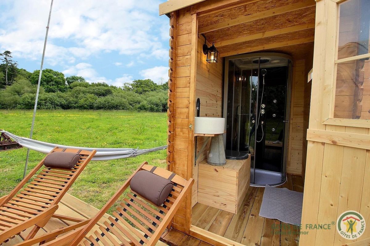 Juste à côté : le cabanon bois renferme la salle d'eau privative avec douche d'angle, vasque et toilettes sèches.                     Terrasse bois avec chiliennes et hamac.